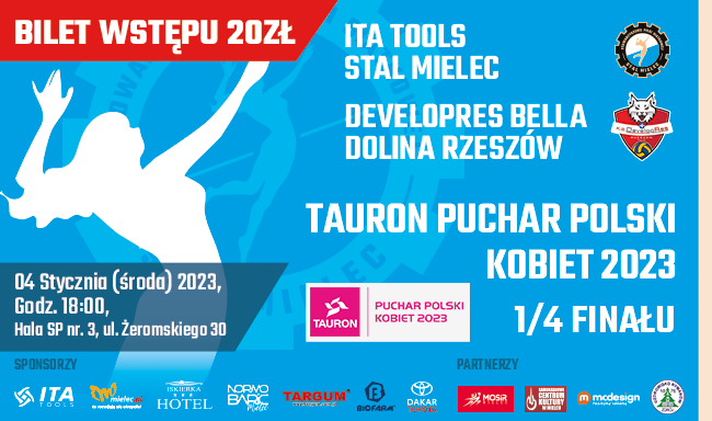 W środę, 4 stycznia, zespół ITA TOOLS Stal Mielec zmierzy się w 1/4 finału Tauron Pucharu Polski Kobiet 2023 z drużyną Developres Bella Dolina Rzeszów. Mecz zostanie rozegrany w hali SP nr 3 w Mielcu przy ul. Żeromskiego 30 o godzinie 18:00. Bilety w cenie 20 zł do nabycia w hali SP nr 3 przy ul. Żeromskiego 30, w dniu meczu, od godziny 17:00. Serdecznie zapraszamy wszystkich sympatyków na to spotkanie.