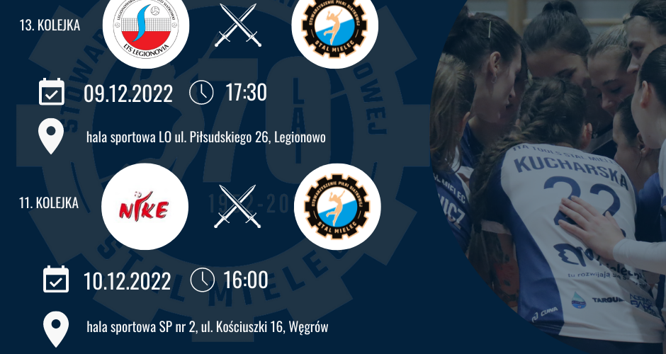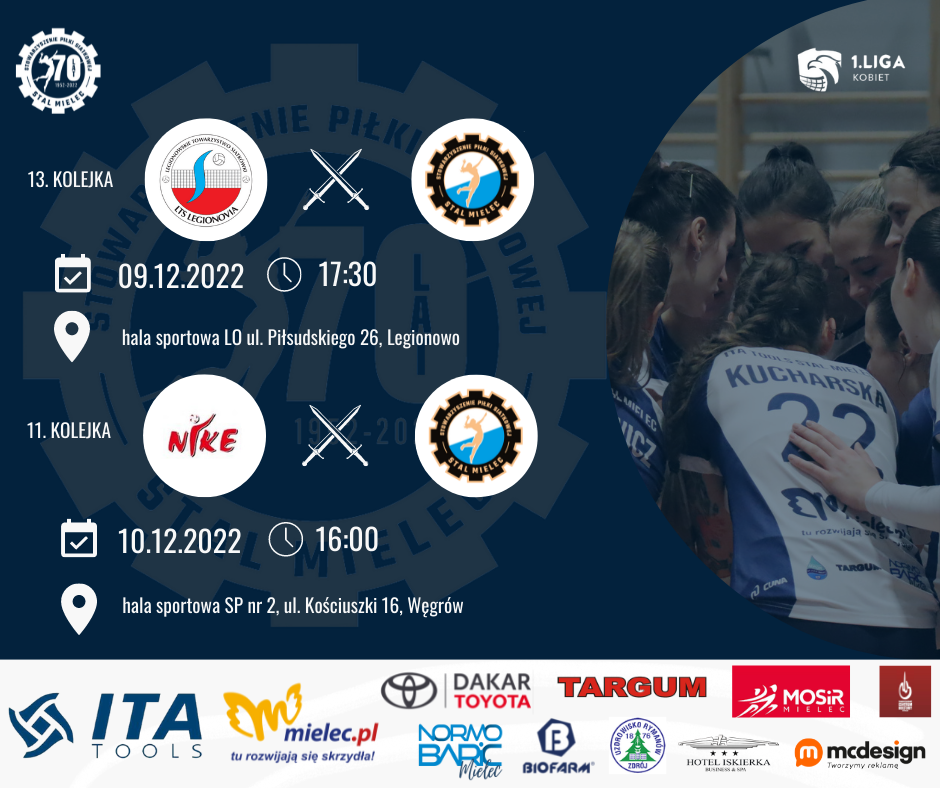 W nadchodzący weekend ITA TOOLS Stal Mielec zagra dwa spotkania wyjazdowe. W ramach 13. kolejki Biało-Niebieskie rozegrają mecz awansem z drużyną LTS Legionovia Legionowo, to spotkanie zaplanowane jest na piątek 9 grudnia na godzię 17:30 w hali sportowej przy ul. Piłsudskiego 26 w Legionowie. Natomiast w sobotę, 10 grudnia nasz zespół zagra w Węgrowie z drużyną PMKS Nike Węgrów, która aktualnie plasuje się na 7 miejscu w tabeli 1. Ligi Kobiet. Ten mecz rozpocznie się o godzinie 16:00.