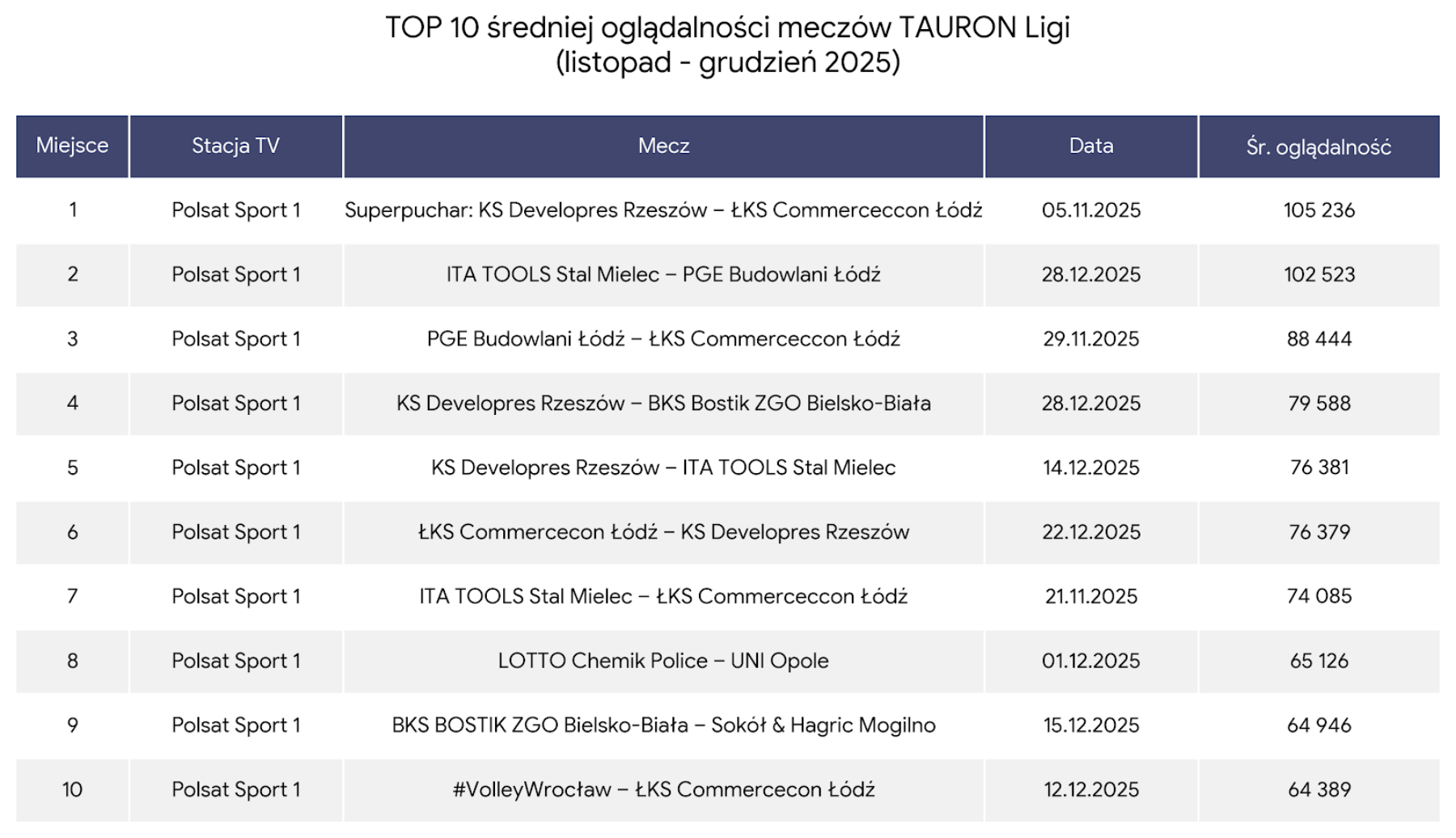 Szczególnie cieszy fakt, że w ścisłej czołówce najchętniej oglądanych spotkań znalazł się mecz rozegrany w Mielcu. Starcie ITA TOOLS Stal Mielec – PGE Budowlani Łódź obejrzało średnio ponad 102 tysiące widzów, co dało mu drugie miejsce w zestawieniu TOP oglądalności listopada i grudnia 2025 roku.